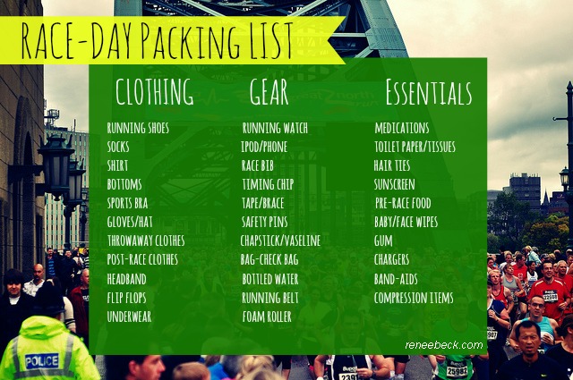 Saturday is race day! I’m into the thick of packing and made this list to make sure that I have all that I need. If you’re getting ready for race day, feel free to use it for yourself. A few notes: