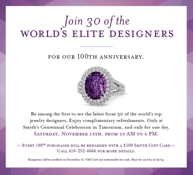 Smyth will celebrate its birthday and 100 years in business with its largest jewelry show of the year from 10 a.m. – 6 p.m. on Saturday, Nov. 15 at its Timonium showroom where more than 30 of the world’s top jewelry designers will showcase their collections. Customers have reason to celebrate too, as every 100th purchaser will be rewarded with a $100 Smyth gift card.