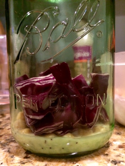 I also learned that the layering is important. You need some “hard” ingredients — things that won’t suck up the dressing at the bottom. Here’s what I tend to work with: