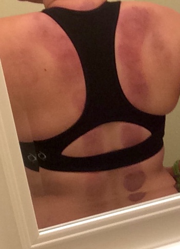 My masseuse doesn’t use fire, but I’m totally open to it. There’s a light pressure and suction feeling, but it doesn’t hurt at all. The purple is deceptive; there’s NO bruising. It doesn’t hurt at all.