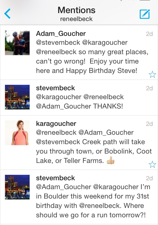 We wanted to run in Boulder, so we hit up super runners, Adam and Kara Goucher, for their recommendations. And they tweeted back! We took their recommendations and ran three miles along the Boulder Creek Path.