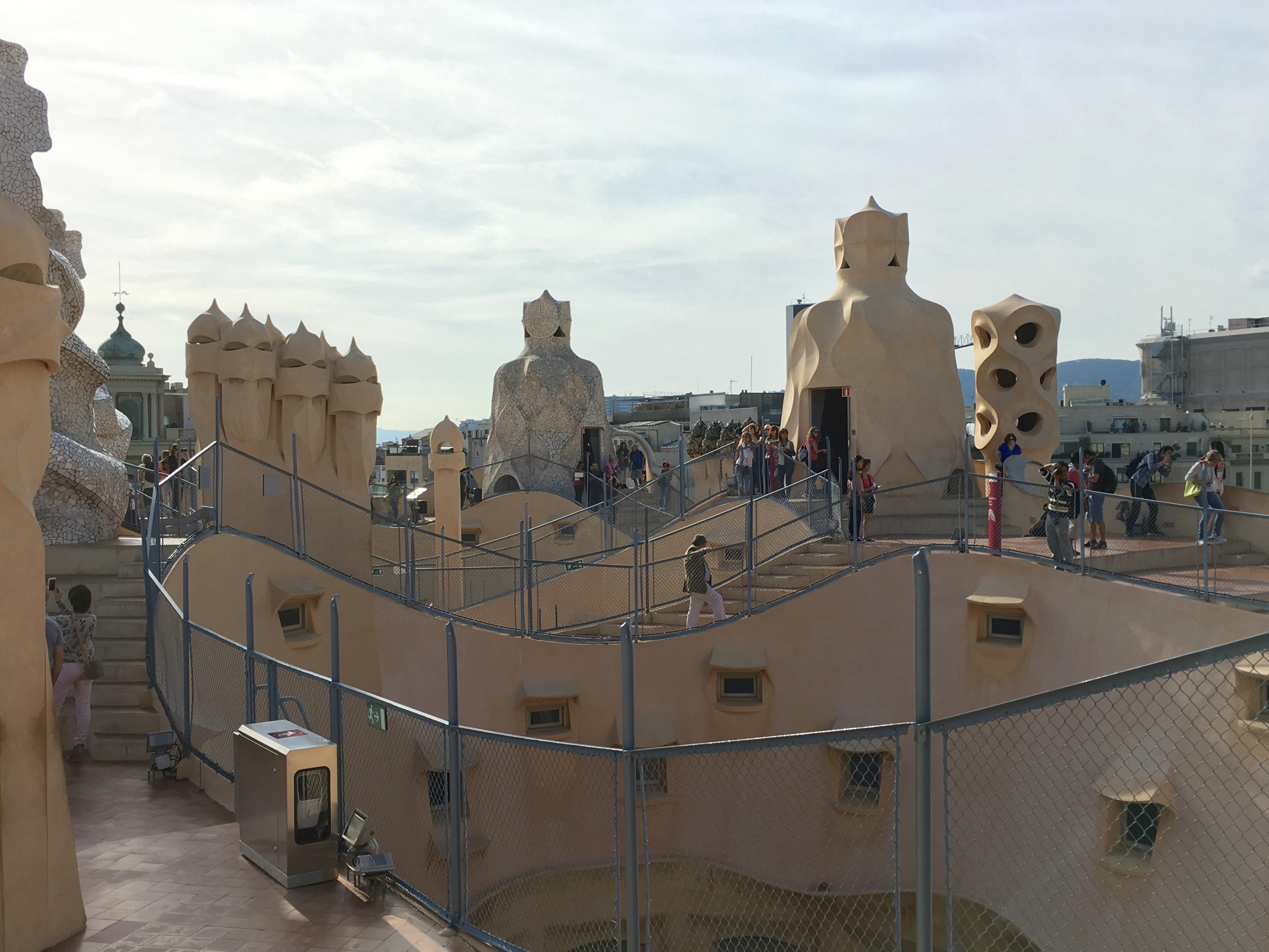 We stopped to admire Casa Batlló but the line was pretty long. We skipped ahead to Casa Milà (aka Casa/La Pedrera) and were able to get in pretty quickly. It was actually a home commissioned by a local businessman. The stone exterior is a wave pattern, which extended to the interior. We toured one of the apartments and were able to go on the roof, which is dotted with skylights and chimneys (which look like they have faces). There were amazing views of the city, including Gaudi’s Sagrada Familia.